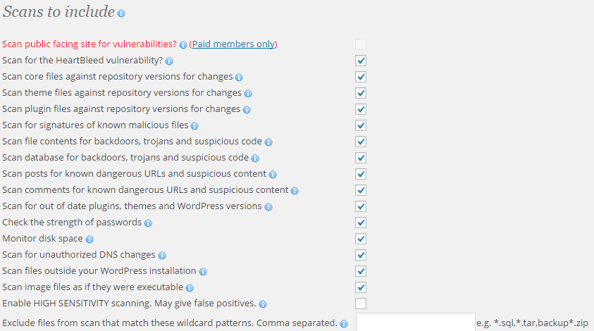 Before running a scan, let's go to options and change our settings to use very thorough scanning. Log in to your WordPress Dashboard and click on Wordfence, then Options. Once there, scroll down to Scans to Include.