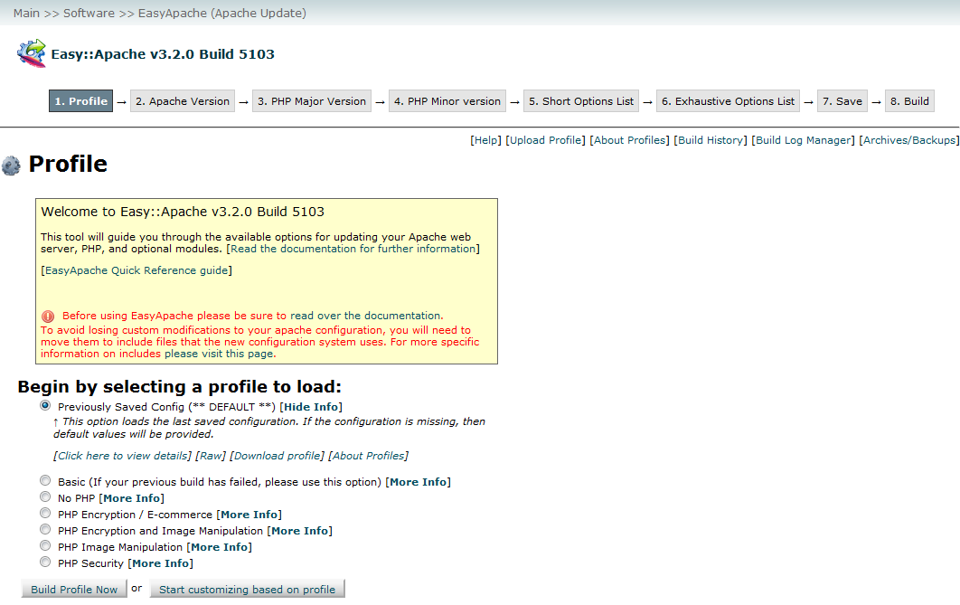 You can select any one of the build options listed on this screen and select Build Profile Now and the system will automatically rebuild Apache+PHP based on that profile. Click the More Info link next to the profile for more information on what it builds.