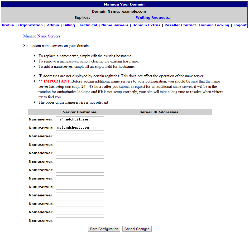 - Change the nameservers to ns1.ndchost.com and ns2.ndchost.com or to match nameservers that you created in your WHM interface